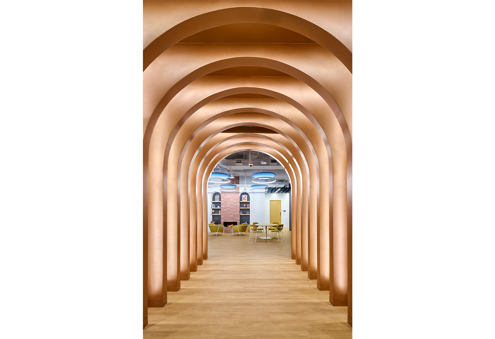 The dramatic arched wooden portal in the entry area demonstrates how integrated lighting can enhance architectural features, drawing visitors through the space.