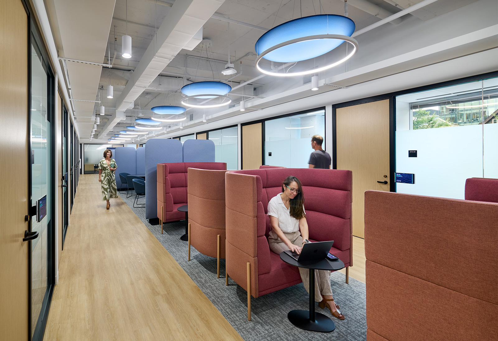 The lighting design plays a crucial role in defining the character of each area: sculptural blue and white circular pendant fixtures provide focal points in collaborative spaces, while globe pendants of varying sizes create visual rhythm throughout the multi-level interior.