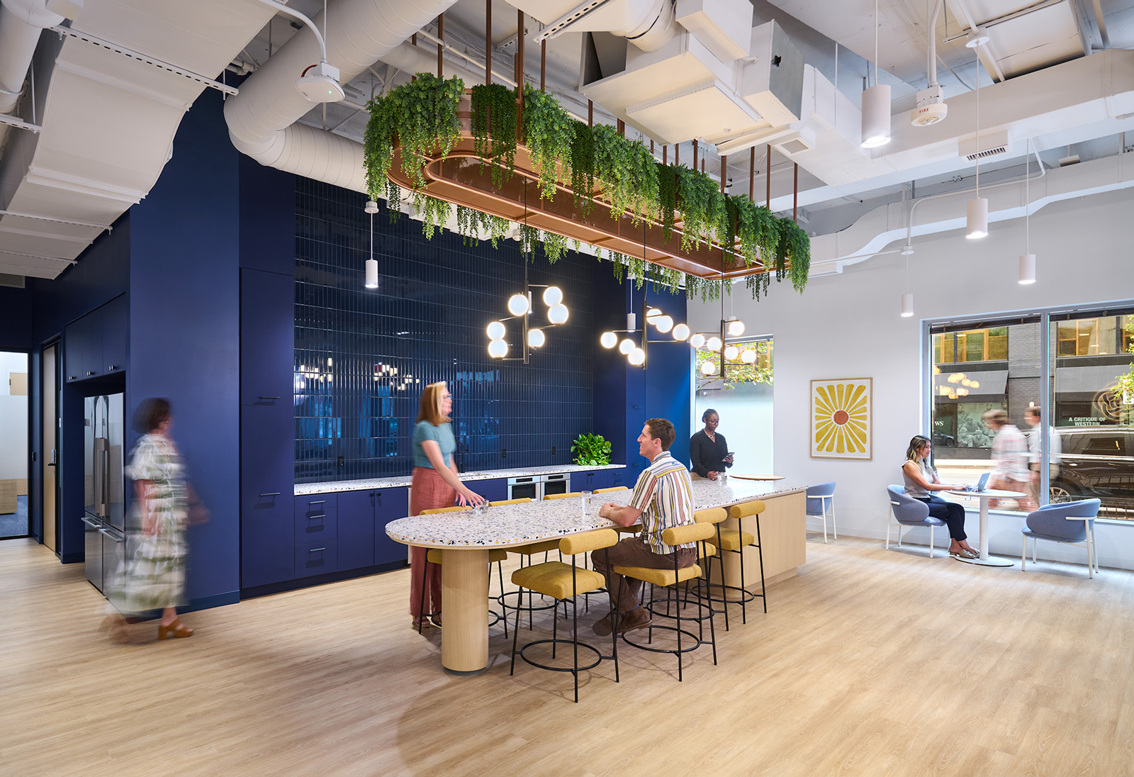 The Chicago School's Los Angeles campus showcases a thoughtfully designed educational environment that balances modern functionality with warm, inviting aesthetics. The space features a striking combination of natural wood elements, deep navy accent walls, and organic touches like suspended greenery that create a welcoming atmosphere for students and faculty.